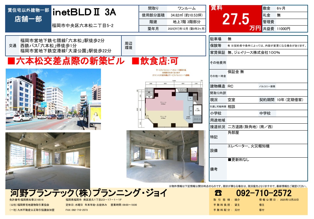 - ※六本松交差点際新築ビルの3階角部屋