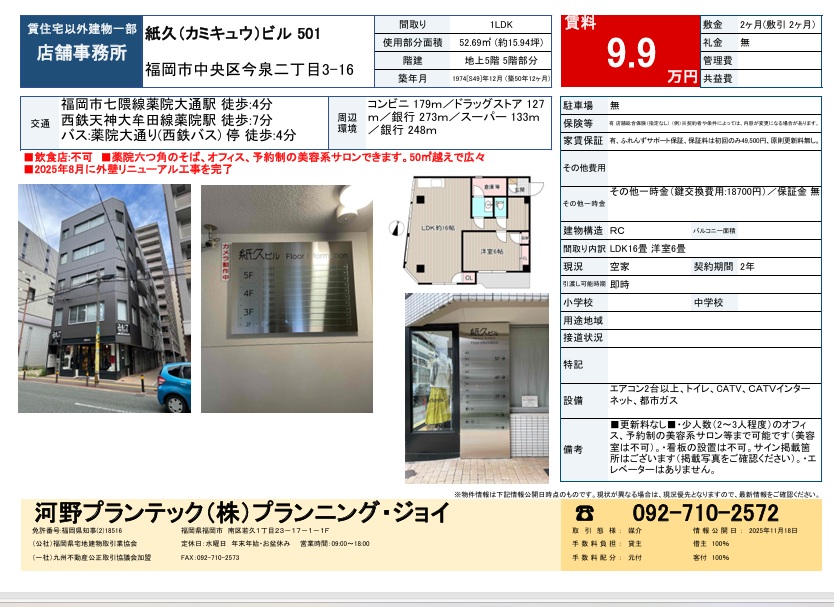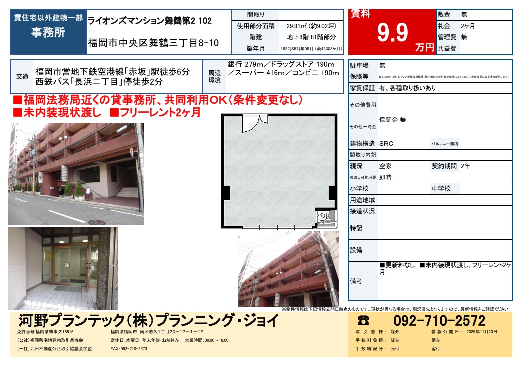 福岡市中央区舞鶴三丁目 1階 事務所9.9万円- 物件種別